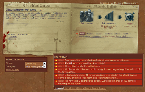 The Attack of the Hordes takes place every night at midnight (23:00 game time in the UK version), the zombies attack the town and attempt to kill citizens. Citizens who die outside during the night will be added to the horde. The citizens in town must build various defences to keep the shuffling, groaning masses at bay.